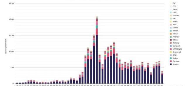 6、合規中心化交易所的現貨交易額在四月份下降了43.8%,達到約4005億美元,之所以會出現如此大幅度的下跌,很大程度上是因為幣安恢復收取比特幣交易對費用。