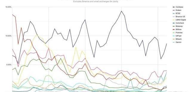 7、四月各大加密貨幣交易所的市場份額排名如下:幣安為71.6%、Coinbase為8.7%,Kraken為4%、BTSE為3.8%。