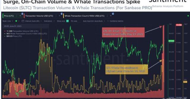 根據鏈上分析平臺Santiment的數據,萊特幣(LTC)網絡最近經歷了鏈上交易量的大幅飆升,尤其是鯨魚交易。事實上,萊特幣網絡的交易量已達到兩年來的新高,表明市場活躍度顯著增加。此外,網絡上的鯨魚活動已飆升至1月以來的最高水平,反映出人們對這種加密貨幣的興趣日益濃厚。