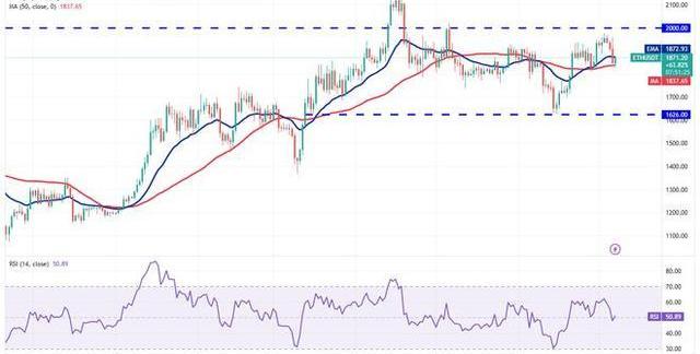 兩條移動平均線均已趨于平緩,相對強弱指數接近中點,表明供需平衡。如果空頭將價格跌破50日移動平均線,短期優勢將向空頭傾斜。隨后ETH/USDT貨幣對可能會跌至1,626美元。