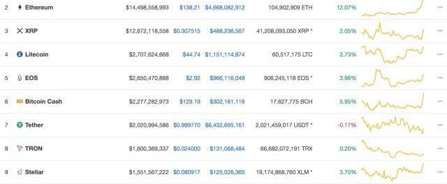 以太幣目前市值來到了約145億美元,重新超越了先前瑞波幣市值,目前瑞波幣市值為約126億美元,24小時漲幅為2.05%,價格為約0.307美元。