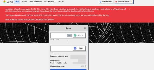 如今,打開Curve官網頁面首先映入用戶眼簾的就是Vyper漏洞相關的資金池安全提示:由于Vyper重入鎖故障,使用Vyper0.2.15、0.2.16和0.3.0的資金池被攻擊,這些資金池的流動性已被抽干,團隊正在評估受影響的情況。受影響的資金池包括alETH/ETH、msETH/ETH、pETH/ETH和CRV/ETH,其余資金池未受影響。