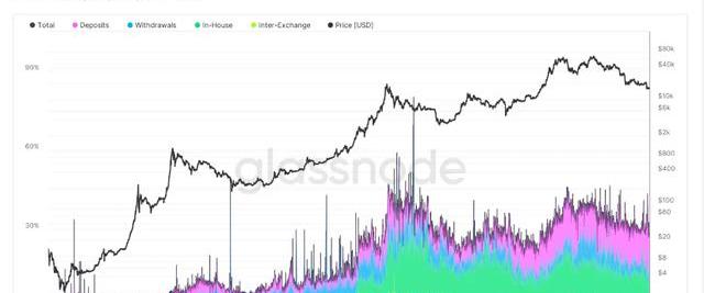 上圖顯示比特幣交易費用占與比特幣相關的所有交易所收入來源的36%。它還表明,存款和內部轉賬在過去五年中呈指數級增長。