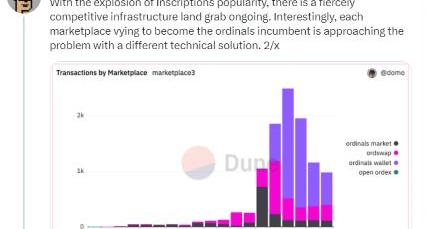 在3月6日,他關注Blur與Opensea沖突的陰影下,Ordinals對市場的擴張,隨著ordinals流行度的爆炸式增長,激烈的基礎設施爭奪正在進行。其中OrdinalsMarket以現有的以太坊基礎設施,使用EmblemVault開發的技術促進以太坊區塊鏈上的比特幣銘文交易,以規避比特幣網絡速度慢和體驗差的問題,其他方則采用新穎的比特幣原生解決方案。