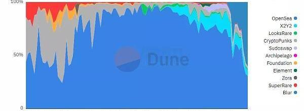 10月,NFT市場Blur正式上線,且推出了相對應的空投計劃,吸引了大量NFT交易者體驗。Blur既是直接交易市場也是聚合器,憑借著平臺的高效易用、低費用、空投這一套組合拳,Blur迅速搶占了很大一部分市場份額。