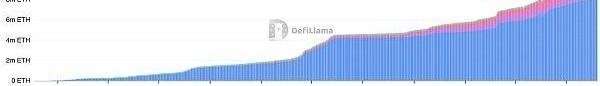 請注意,最后一個圖表納入了LSDfi項目,其中您可以存入像Lido的stETH這樣的流動性質押代幣。如果我們將這些項目排除在外,我們將看到更低的總鎖定價值,僅為1250萬ETH。
