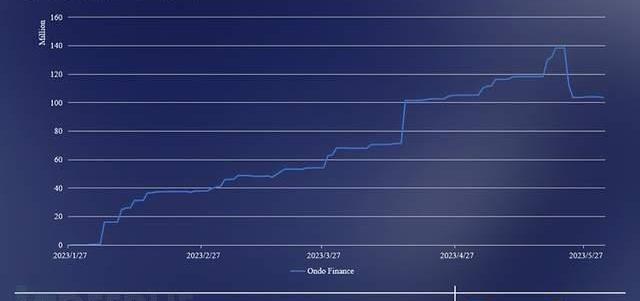 OndoFinance于今年1月上線鏈上債券,5月20日,TVL創歷史新高,達1.38億美元,此后略有下降。截至5月31日,TVL為1.03億美元。