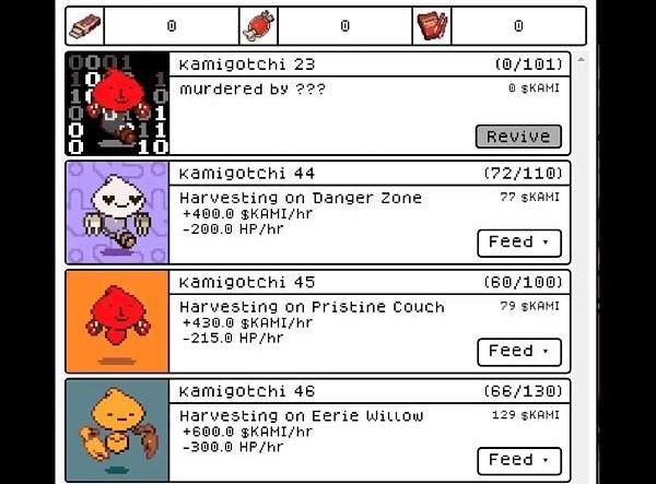 Kamigotchi是一款具有PvP機制的多人在線角色扮演閑置游戲。您可以使用您的Kamigotchi從世界各地散布的節點中收獲$KAMI。$KAMI可用于升級您的Kami并購買食物。然而,收獲會消耗您的Kami的生命值,當生命值較低時,其他玩家可以使用他們的Kami獵殺您的Kami。您需要保持您的Kami充饑并仔細觀察它們以獲得最大產出。死亡并不是永久的,核心NFT不受影響,但這會讓您付出代價——被殺死的Kami在游戲中無法再次使用,除非使用商店中的某些消耗品復活,當然這需要$KAMI。此外,您的Kami會因為這次經歷而心情受挫。