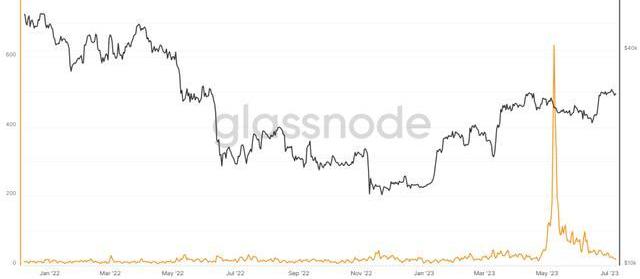 Glassnode數據顯示:目前比特幣網絡打包費用持續走低,這表明比特幣網絡交易活躍度持續降低,市場交易熱情匱乏。