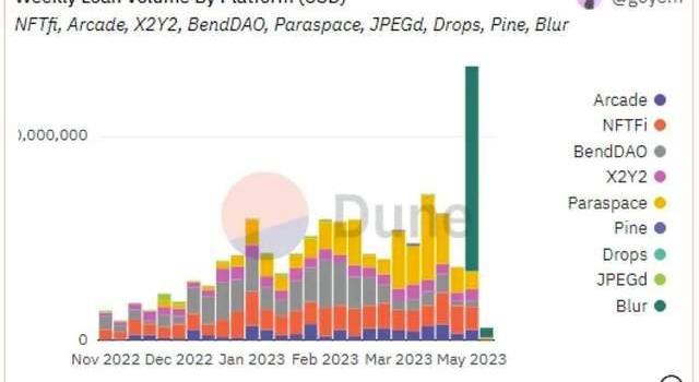 1.Blend的推出見證了NFT借貸領域的發展。與前一周相比,貸款量增加370.5%。本周,Blur交易量占比高達74.6%。