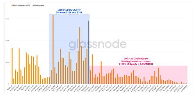 2023年比特幣市場的復蘇是非常強勁的,無論是價格表現,還是網絡使用率。下圖可以幫助我們更好地理解這一點,它展示了在低于3萬美元的價格下買入的比特幣的大致情況。