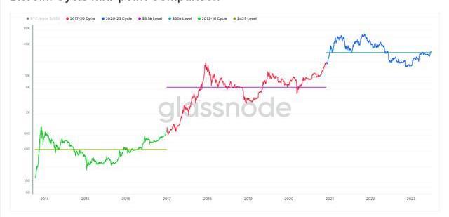 在各個不同的周期中,比特幣的數據總是會出現驚人的相似。在2021-2022年的周期中,3萬美元的價格水平在某種程度上可以看作是「中點」,并在該點上下波動。