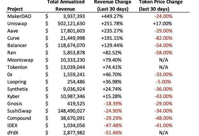 是DEFI項目的30天收益增長率與價格下跌率之間的一個對比圖。DEFI龍頭項目的這個對比分別如下: