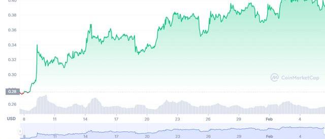 根據CoinMarketCap.com的數據,智能合約平臺Cardano(ADA)在過去五周內上漲了65%以上,從1月1日的0.24美元漲至目前的0.3913美元市場價格。其市值也從86.3億美元飆升至135億美元。