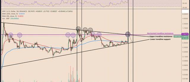 自2018年以來,XRP價格的上漲趨勢一直受到下降趨勢線阻力的限制。除此之外,0.93美元左右的水平阻力線使第四大加密貨幣的情況進一步復雜化。