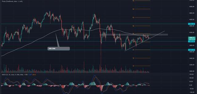 在加密貨幣圖表上,插圖提供了一個完美的上升三角形示例。ETH代幣價格的4小時時間框架圖顯示上升三角形模式。該形態的頸線位于4150美元和4100美元之間,這是買家必須克服的主要阻力才能開始上升趨勢。