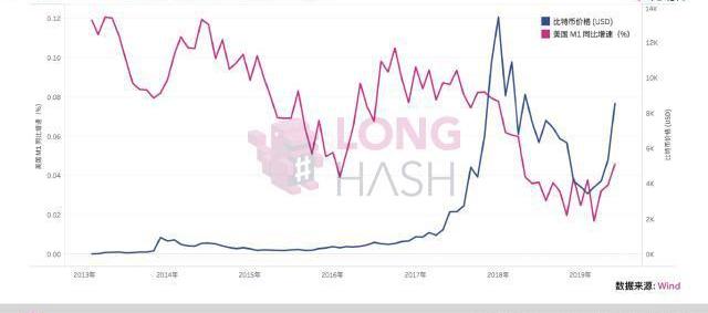 進一步觀察兩者在2018年1月至2019年6月的走勢可以發現,M1同比增速與比特幣的價格均在2019年1月至3月間出現觸底現象,而在4月出現反彈的趨勢。某種程度上來說,目前的數據量并不足以支撐我們給出一個精準的結論,但我們有理由相信,隨著數字貨幣市場的不斷成熟,貨幣供應量將會逐步影響數字貨幣的價格走勢,M1等指標將在未來比特幣價格走勢的預測中表現的更加優異。
