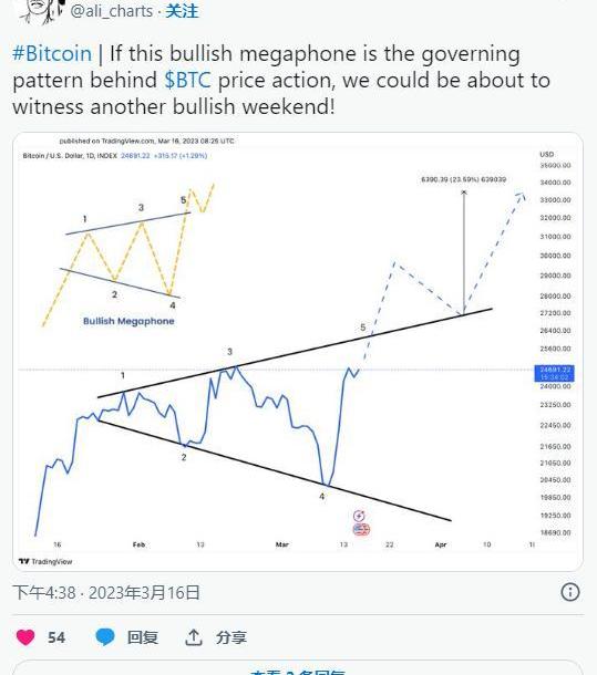 加密貨幣分析師AliMartinez預測,如果比特幣正處于看漲擴音器的技術模式中,那么周末比特幣價格將再次看漲。