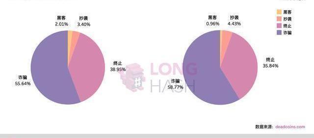 這些項目是如何走向死亡的呢?DeadCoins.com將這些項目分成了四類,分別是Deceased(終止),Hack(黑客),Scam(詐騙)和Parody(抄襲)。其中詐騙跑路的項目占據了大頭,2019年和2018年分別有58%和55%的項目都是屬于割韭菜跑路項目,而做不下去終止的項目分別占到35%和38%,剩下的一小部分項目屬于被黑客攻擊或者是抄襲其他項目。