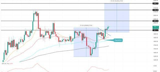 旗形形態突破利用以太坊價格及其在形成過程中確定的預定目標。該圖表模式有兩個已知目標,即旗形寬度和完整旗桿,均從突破點測量。因此,ETH的第一個目標是1980美元左右,第二個目標是2200美元