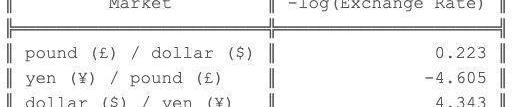 請注意,每個方向上的匯率大約是彼此的倒數。這意味著,如果將英鎊兌換美元的匯率是0.8英鎊/美元,那么相反的匯率將是1/=1.25美元/英鎊。對我們來說,結果是我們需要謹慎對待每個市場上的買賣,將其視為具有不同權重的不同的有向邊。
