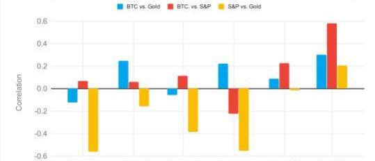 與此同時,在現實中,實際的市場數據卻截然不同。比特幣與標準普爾500指數(S&P500)的關聯度最近創下歷史新高。比特幣與黃金的相關性也為正,但程度低于與標準普爾500指數的相關性。