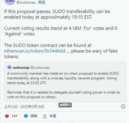 昨日,sudoswap已通過開啟SUDO轉帳的社群提案,共有61個地址、418萬枚SUDO參與投票,贊成率近100%,目前鏈上數據顯示SUDO已啟用轉帳功能。