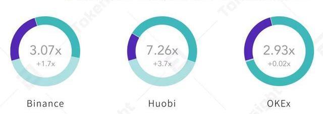 2020年以來,各交易所不斷將業務重心向衍生品交易傾斜。重點交易所前三名平均衍生品成交量為現貨成交量的4.4倍;其中HuobiGlobal/HuobiFutures的衍生品/現貨比例在本季度增加3.7倍,達7.26倍。同時,全市場合約成交量為現貨成交量的0.53倍。