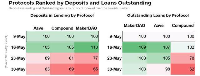 價格表現表明,未償還貸款是價格恢復的一個重要指標,但貸款中的存款是一個不相關的指標。在5月份的拋售中,Maker表現出色,而Compound則表現不佳。盡管Aave的貸款中的存款減少得最少,但價格表現卻只是平均水平。這表明,與TVL類似,市場認為貸款中的存款這一點不是很重要。