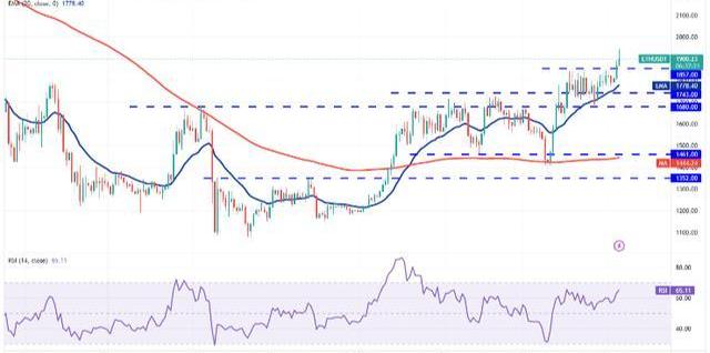 以太坊在4月3日從20日均線反彈并攀升至上方阻力位1,857美元上方。上漲可能預示著上漲運動的下一段開始。它還可能為可能反彈至2,000美元鋪平道路。指示的水平可能會成為強大的阻力位,但如果多頭在下一次下跌期間將1,857美元的水平轉向支撐位,則可能表明買家處于控制之中。然后,ETH/USDT貨幣對可能會嘗試升至2,200美元。熊市的時間不多了。如果他們想成交量土重來,他們將需要停止漲勢并將價格推低至1,857美元以下。如果他們成功了,多頭可能會落入陷阱。該貨幣對可能跌至20日均線,然后跌至1,680美元。