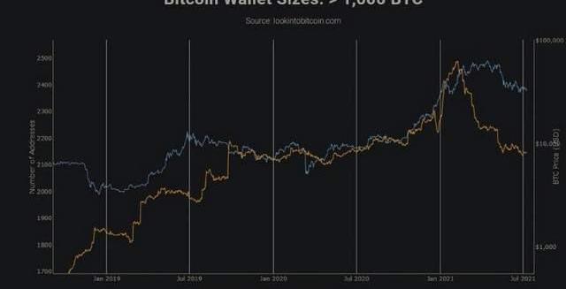在最近的Twitter帖子中,我解釋了持有1000多個BTC的比特幣鯨魚幾個月來一直在拋售。數據顯示,現在比特幣鯨魚的數量比2019年10月要少。