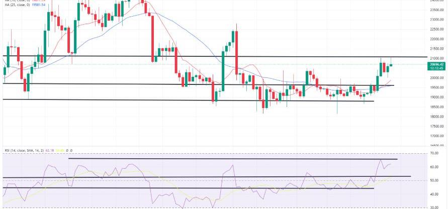 繼昨天的低點20,132.50美元之后,BTC/USD在周末開始時飆升至盤中高點20,988.39美元。