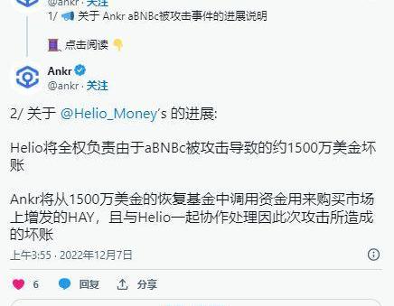 今日稍早,Ankr團隊更新aBNBc被攻擊事件的進展說明,表示Helio將全權負責由于aBNBc被攻擊導致的約1,500萬美元壞帳。