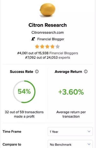還有投資者表示,你做空頭可以,但你的勝率為何一直像在擲硬幣,并曬出了近一年CitronResearch的投資回報。
