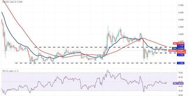 買家有機會通過將價格推高至20天均線以上來開始復蘇。如果他們這樣做,ADA/USDT貨幣對可能會嘗試反彈至下降趨勢線。50天移動平均線(0.35美元)可能會提供小阻力,但很可能會被突破。