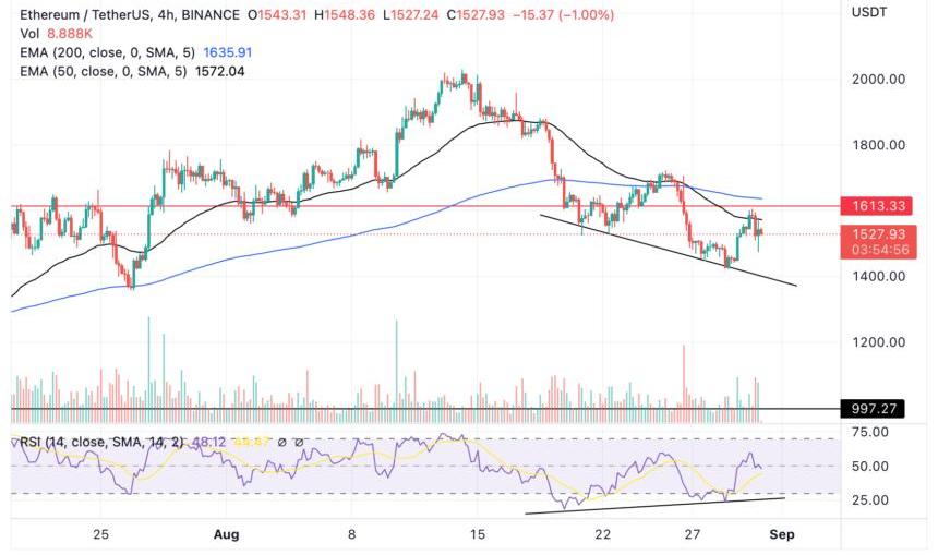 由于價格超賣,在4H圖表上形成看漲背離后,ETH價格反彈至1,600美元,試圖突破50EMA,成為ETH價格的阻力。