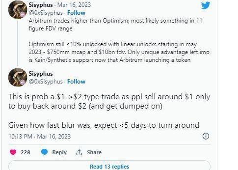 Twitter上的分析師預測$ARB將達到1美元,假設$OPFDV為105億美元,$ARB流通量為12%,TVL為16億美元。