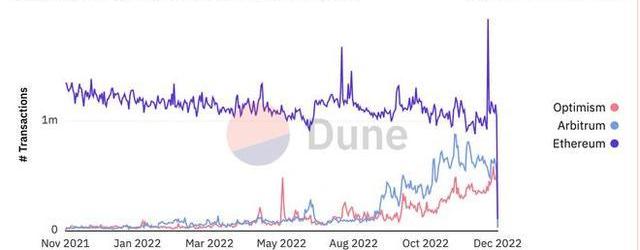 Layer2解決方案增長的另一個指標是解決方案上的交易數量不斷增加。在他們的協議上進行的交易越來越接近在以太坊上進行的交易數量。