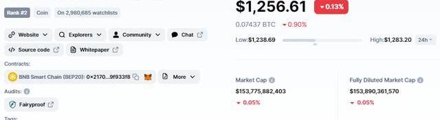 以太坊現價為1256美元,24小時交易量為110億美元。在過去的24小時內,以太坊的漲幅不到0.50%。CoinMarketCap以1530億美元的實時市值排名第二。它的流通供應量為122,373,866ETH代幣,沒有最大供應量。
