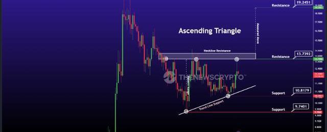 在上圖中,Aptos(APT)呈現上升三角形形態。上升三角形是持續看漲趨勢的特征形態。該三角形由連接高點的水平上趨勢線和連接上升低點的下趨勢線形成。如果趨勢在阻力位突破,價格將在這個上升三角形形態中繼續上行。