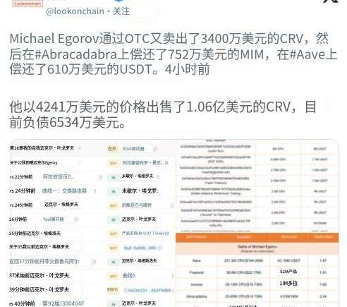 據Lookonchain數據顯示,自從影響Curve的“重入黑客”事件以來,該高管已以4241萬美元的價格出售了總計1.06億枚CRV,目前負債6534萬美元。