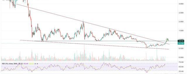 Sushiswap一年多以來一直在下降楔形內交易,最近的價格走勢已將價格從下方支撐位提升至接近上方阻力位。價格需要清除0.918美元的臨時阻力,這可能會清除突破1美元以上的所有障礙。一旦價格穩定在1美元以上,壽司價格可能會迅速上漲,重新回到3美元以上的水平。