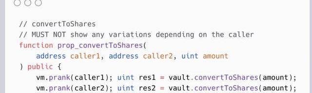 例如,以下屬性對應于convertToShares()函數的要求之一,「不得根據調用者顯示任何變化。」