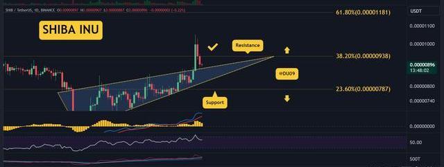 如下圖所示,RSI正在創造更高的低點和高點。這被廣泛認為是看漲跡象,只要價格保持在楔形上方,SHIB可能會繼續走高。