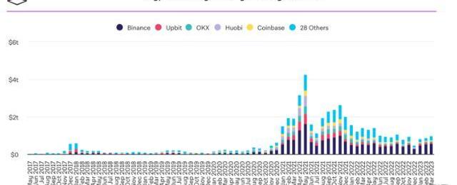 延續第一季趨勢,交易所月交易量皆逐月上升,盡管幣安以糟糕的CFTC訴訟案結束三月,交易量5,563億美元仍超越二月的5,451億美元