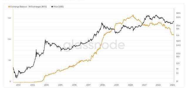 Glassnode數據顯示,自2020年3月起交易所提取了100萬個比特幣,而2022年提取了價值600,000個BTC。如果繼續保持同樣的速度,交易所將在2025年或2026年耗盡。