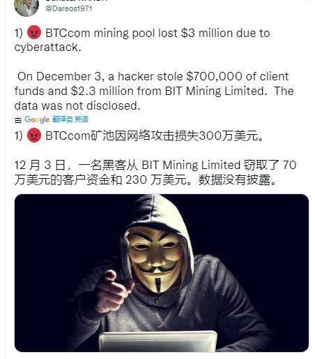 12月26日,BTC.com及其母公司BITMiningLtd.宣布,該公司在12月3日成為網絡攻擊的目標,導致大約300萬美元的資產損失。