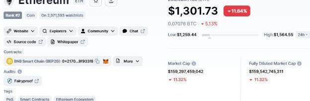 周三,第二大最有價值的加密貨幣,以太坊在過去24小時內下跌約12%,在過去7天下跌超過17%,交易價格為1,303美元。在CoinMarketCap上,它現在排名第二,實時市值為1590億美元,低于昨天的1780億美元。