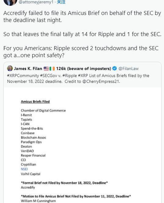 杰里米·霍根(JeremyHogan)律師在報告詹姆斯·K·菲蘭(JamesK.Filan)的法庭之友陳述的狀態時提出了這一點。支持Ripple的Amicus簡報由14個不同的組織提交,包括數字商會、TapJets和I-Remit。
