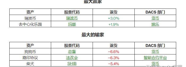 流行的模因代幣DOGE和SHIB最近分別下跌了5.5%和4.8%。衡量加密市場整體表現的CoinDesk市場指數最近下跌了1.2%。
